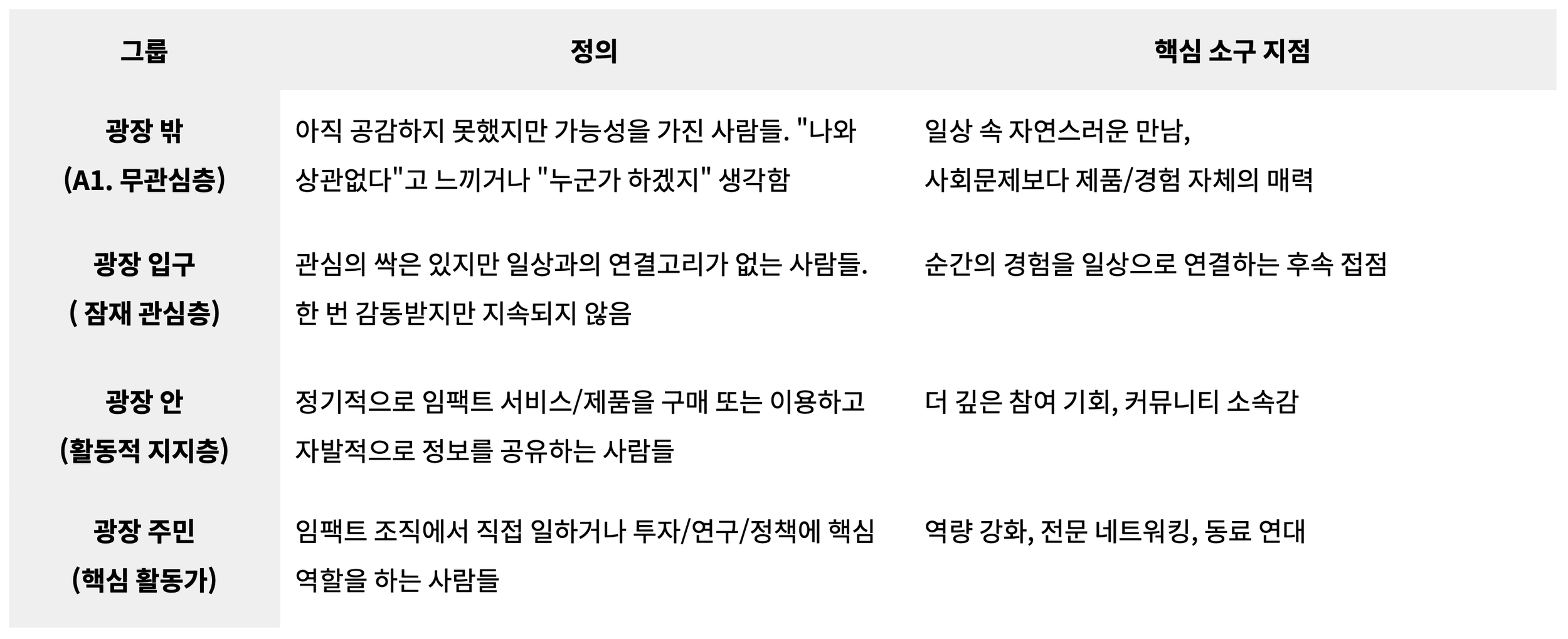 임팩트 생태계를 하나의 광장으로 상상해보자. 사람들은 임팩트 비즈니스나 사회문제 해결에 대해 얼마나 알고 있고, 얼마나 관심을 갖고 있을까? 어떤 이는 광장이 있는지도 모르고(광장 밖), 어떤 이는 광장 근처를 지나치며 한 번쯤 들여다보고(광장 입구), 어떤 이는 광장 안에서 정기적으로 활동하고(광장 안), 또 어떤 이는 광장 중심에서 주도적으로 움직인다(광장 중심). 이 인식과 관여 수준을 광장으로부터의 거리로 나타내면 네 곳으로 나눠볼 수 있다.
